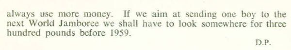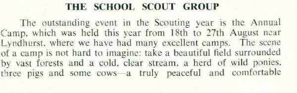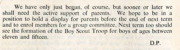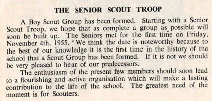 I would like to add to Tony Riley's recollections of the Scout Troop. I was a founding member in 1956. The founder and Skip was 'Percy' Pallant, Biology master. I believe that his first name was David, rather than Dennis, as Tony recalls. However, he is definitely the 'DP' who wrote the Secundrian articles. I was founding Patrol Leader of Kestrel patrol, and other members included Doug Coombes, Doug Pearce and Bob Aldred. One amusing thing occurred in the founding. The choice of scarf colour (half amber, half black) was obvious, but this was not available in the catalogue of scout gear - so it may have been unique at that time. Founders had to find a buddy,, and buy one of each colour between them. My mother, who was a seamstress cut them in half and made up the scarves prior to our first meeting.