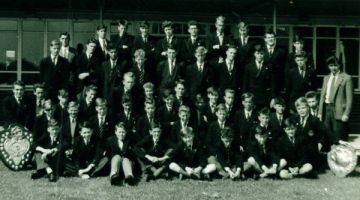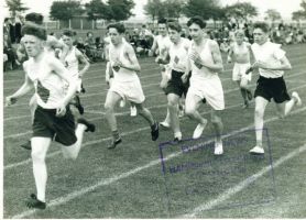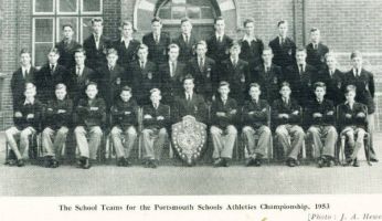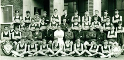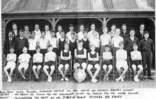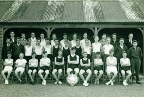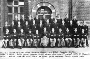 Back row: Spok(?), Mankman(?), ?, White, Samson, Knight, ?, Kettle, ?,?, Bratby. Middle row: Mr Hobson, Finch, ?, Barr, Taylor, ?, Hiller, ? Gallagher, ?,?, Webb Front row: Butterfield, Davis, ?, Honer, ?, ?, ?, Perrett, Dawkins, Eales.